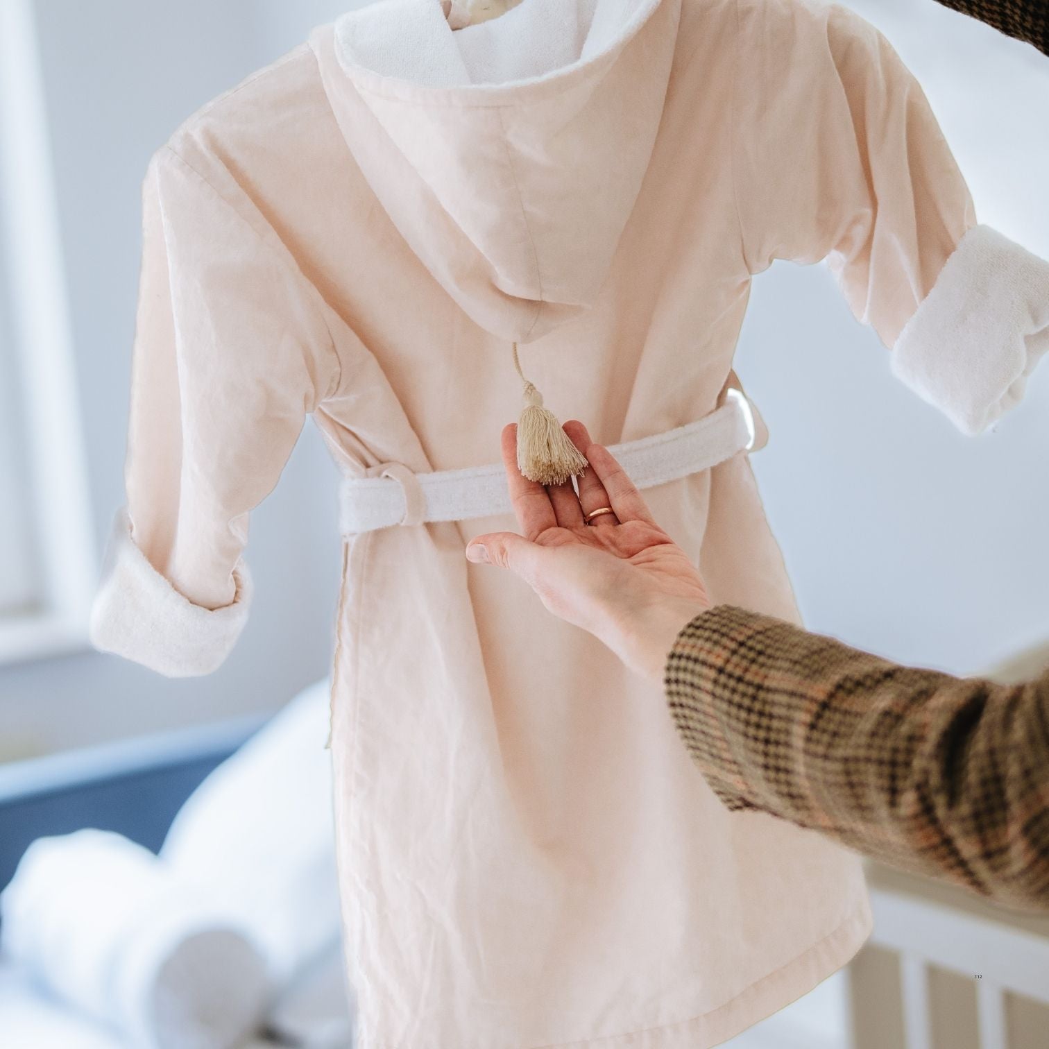 Soft cotton baby bathrobe with an adorable tassel on the hood. Handcrafted in Italy and fully customizable in color for a personal, playful touch.