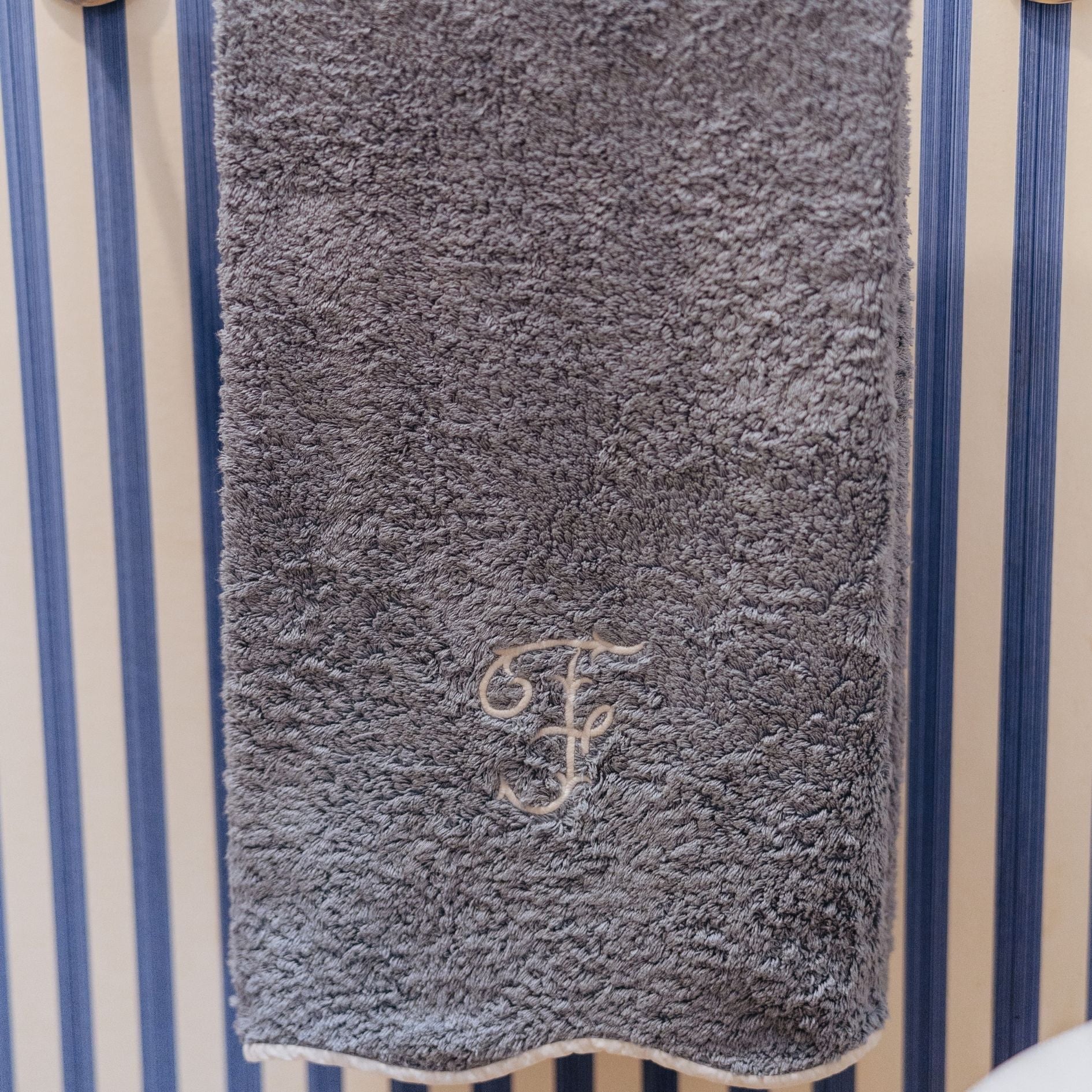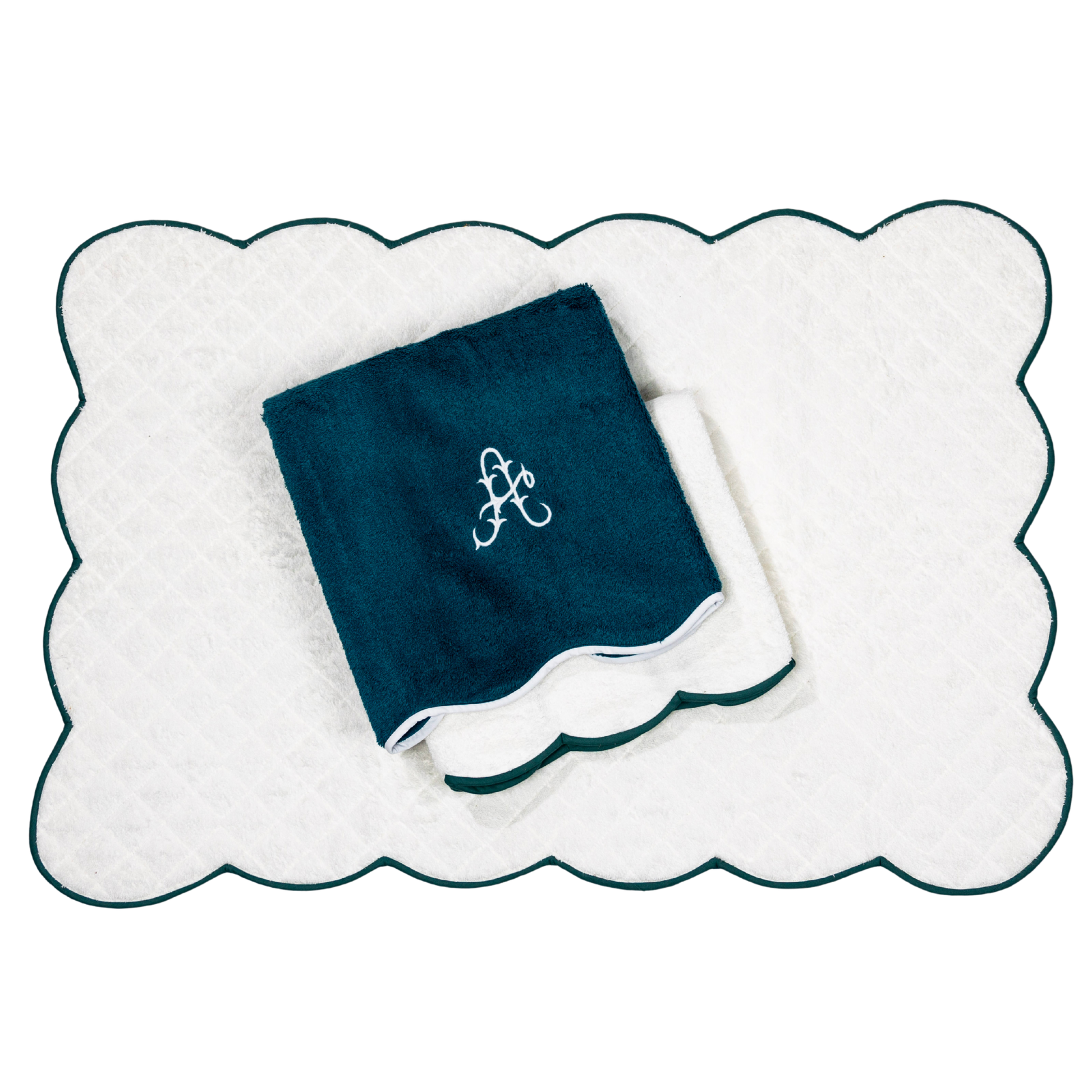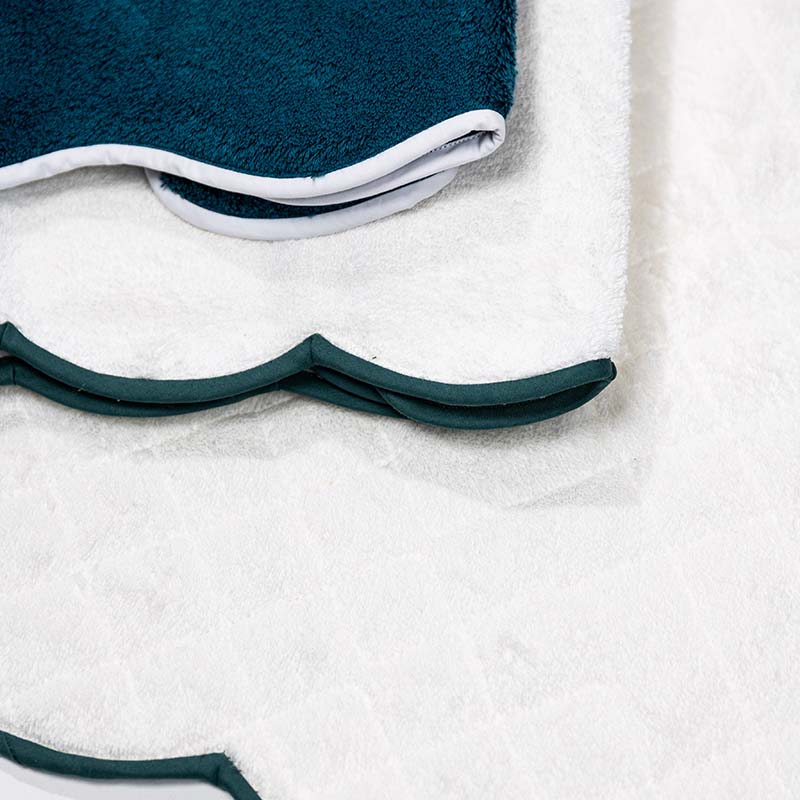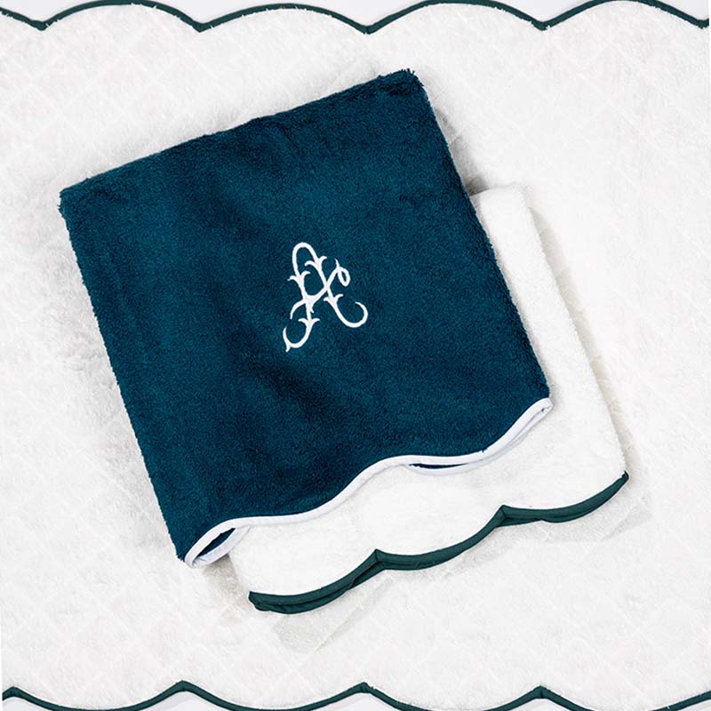 Soft cotton terry towels finished with a gently wavy percale trim. A subtle, elegant design that brings a refined and personal touch to your bathroom. Customizable in color and monogram for a look that’s entirely yours.