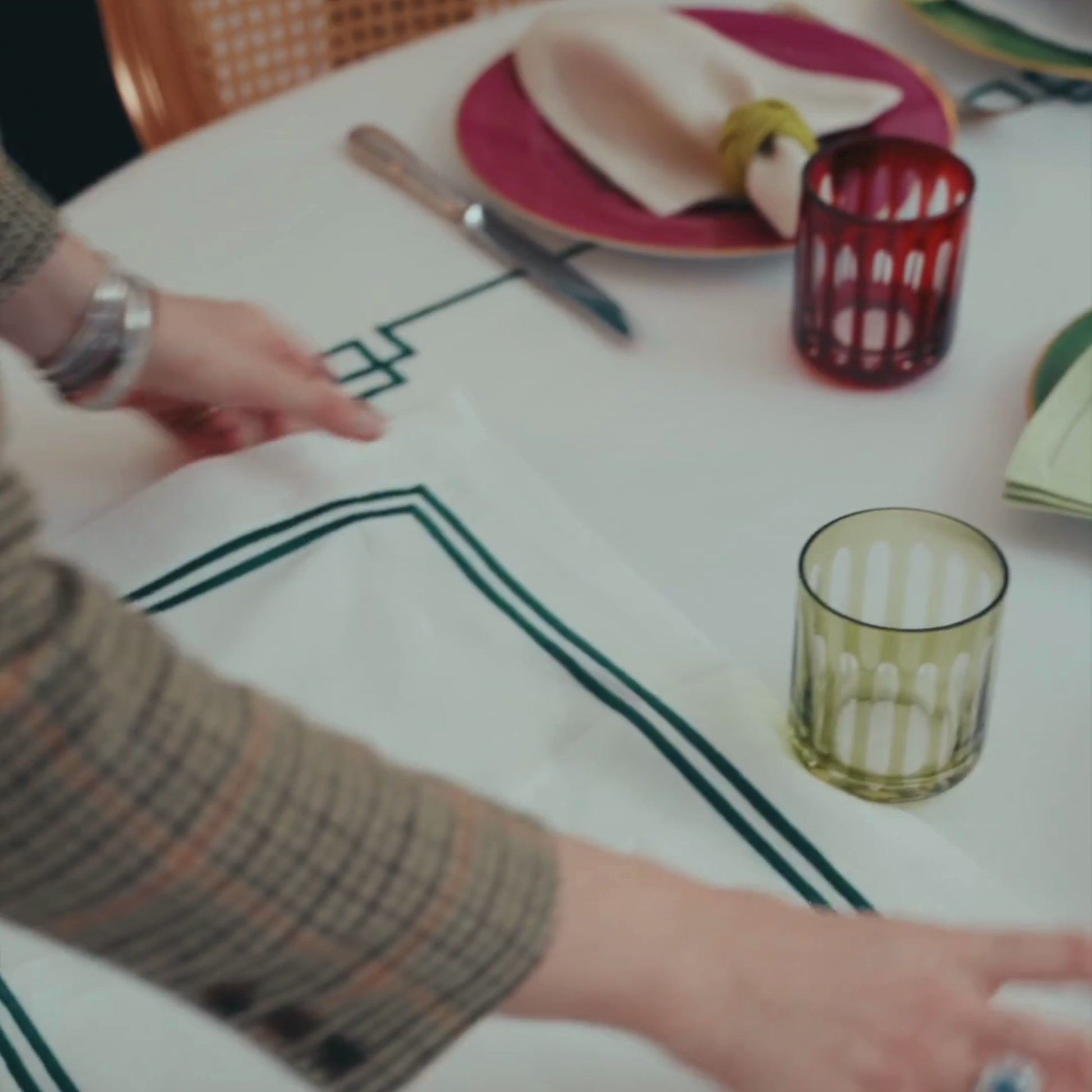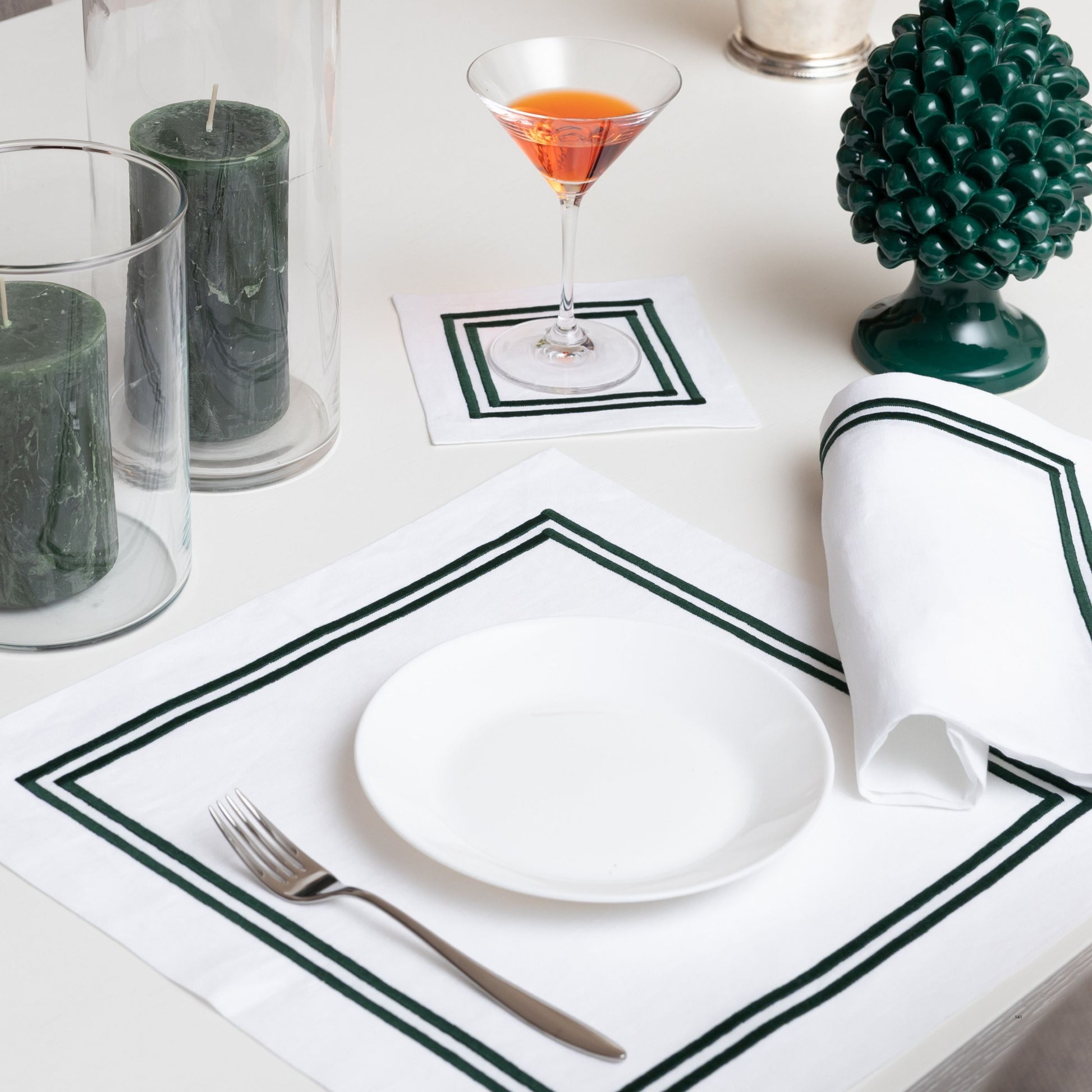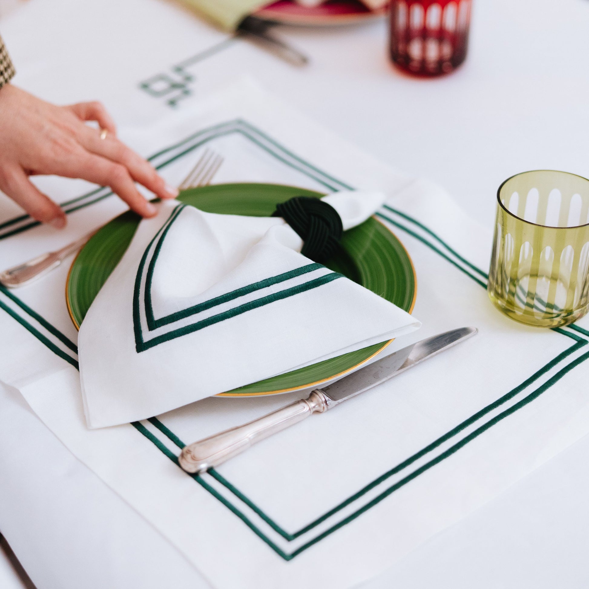A pure linen table set elevated by a delicately embroidered double cord trim—subtle, elegant, and timeless. The perfect expression of quiet luxury, handcrafted in Italy and fully customizable with your choice of colors and monogram.