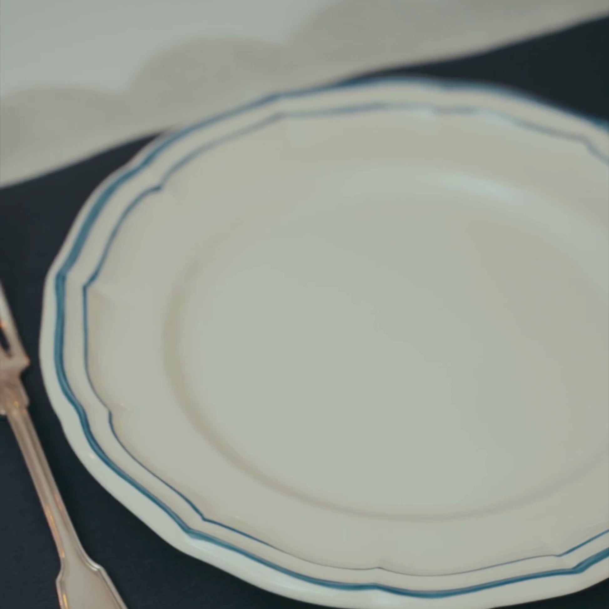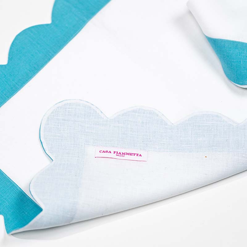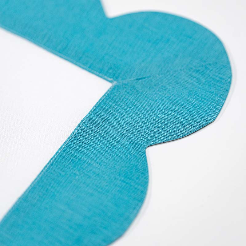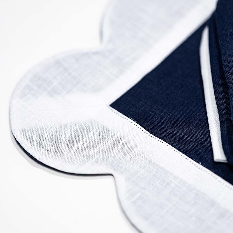 A statement linen table set with a bold scalloped edge—designed for maximalist tablescapes that celebrate color, contrast, and personality. Handcrafted in Italy and fully customizable in your choice of colors and monogram.