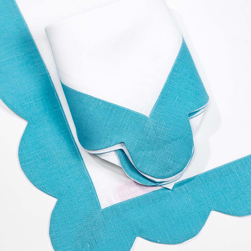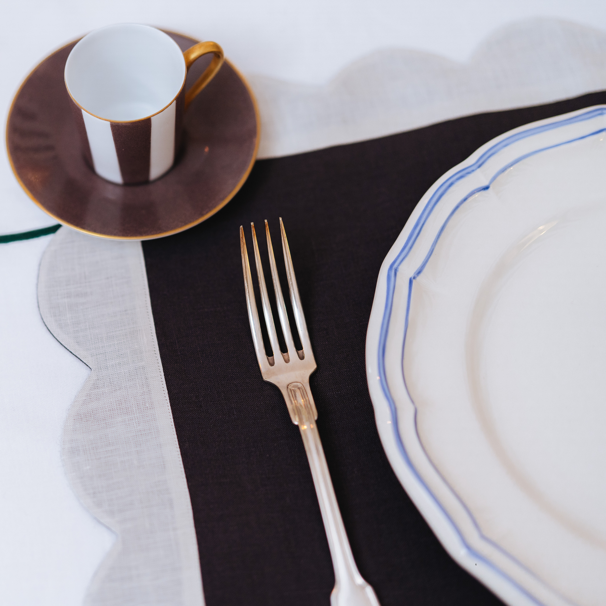 A statement linen table set with a bold scalloped edge—designed for maximalist tablescapes that celebrate color, contrast, and personality. Handcrafted in Italy and fully customizable in your choice of colors and monogram.