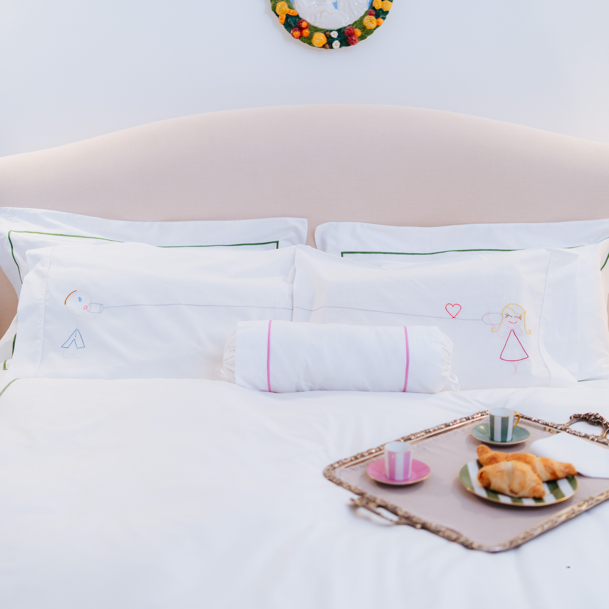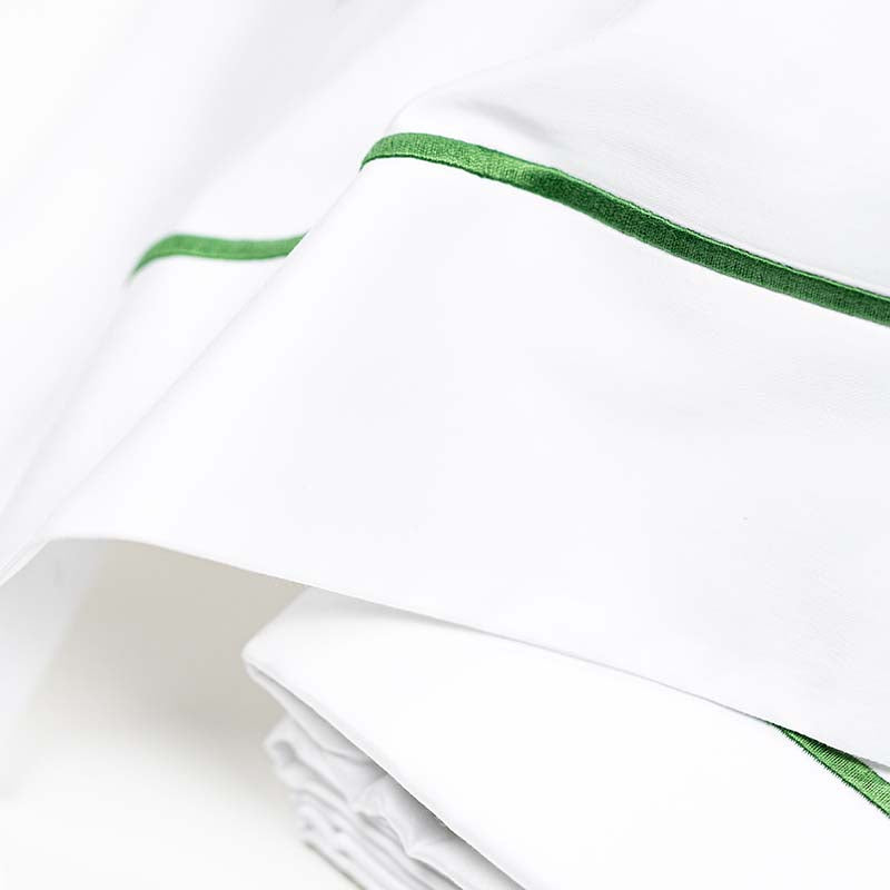 For your made-to-order bed linen, you can choose between Egyptian percale for a matte, crisp look or satin for a silky, luminous finish. Moreover, you can customize the colors of the embroidered cord trims and add personalized embroidery to make your linens truly unique.