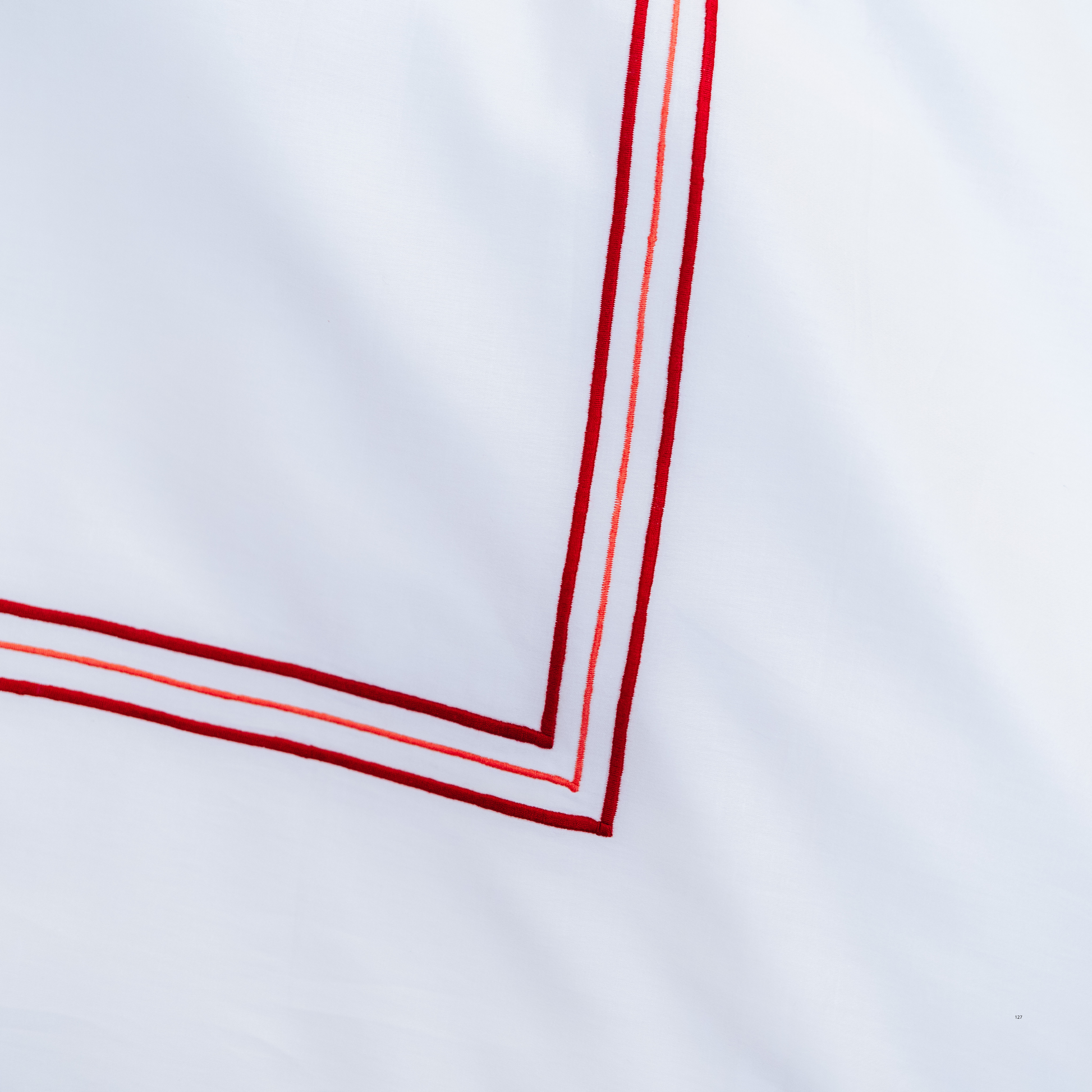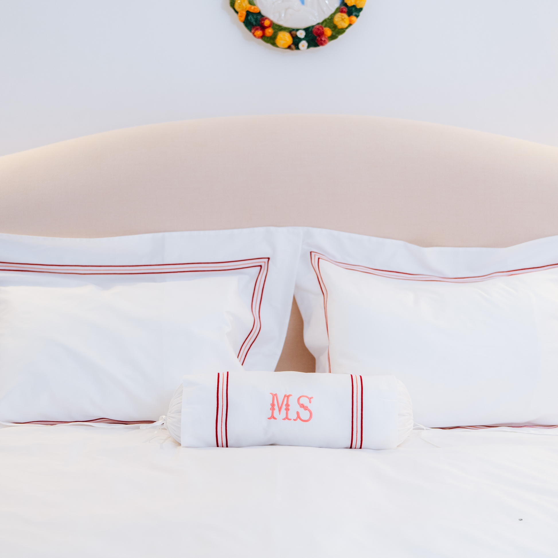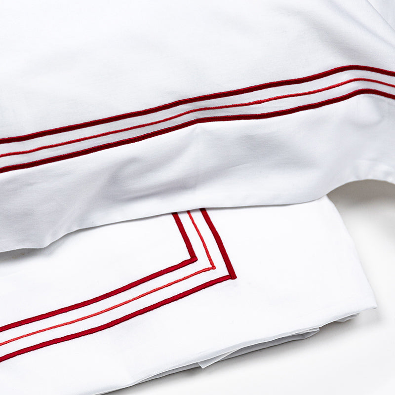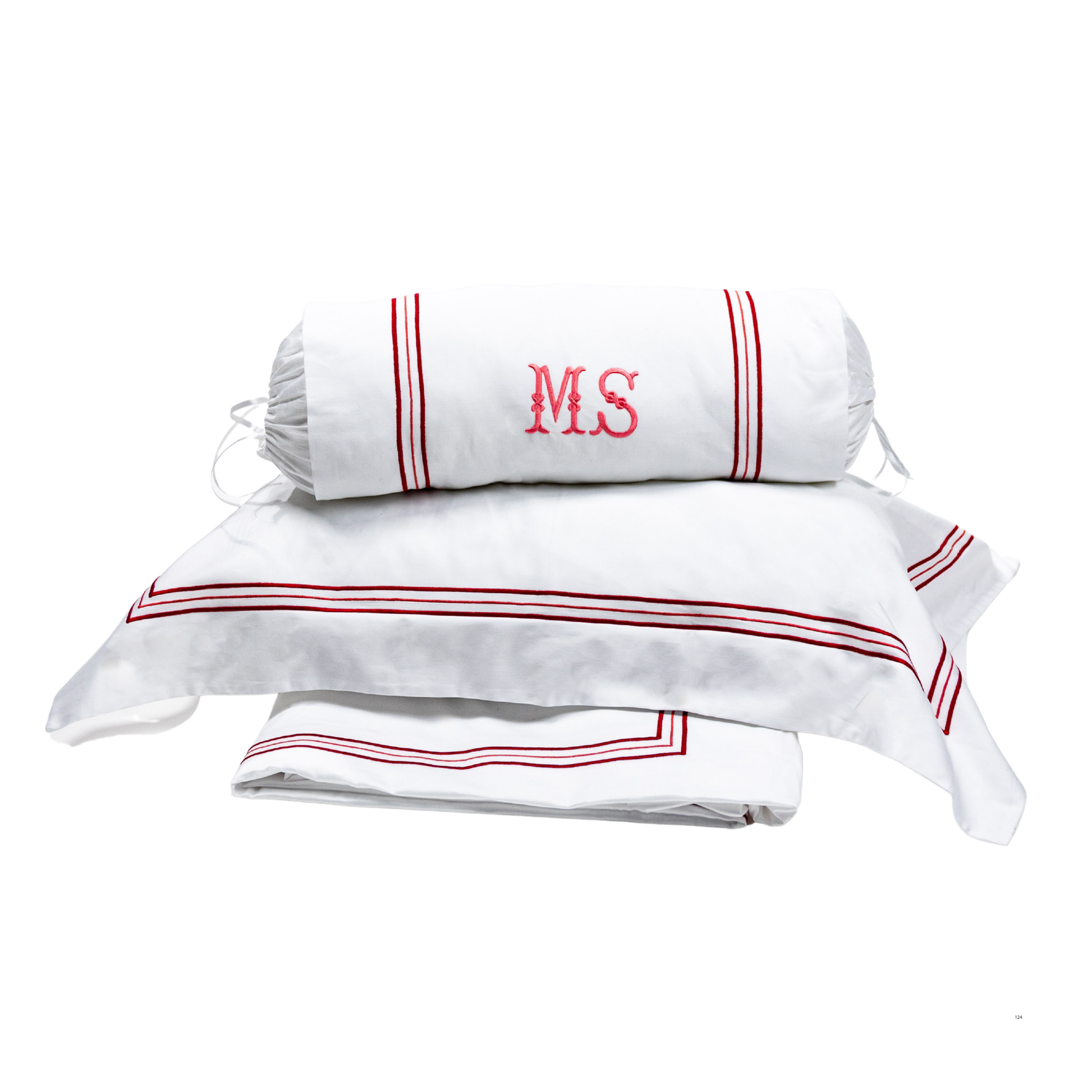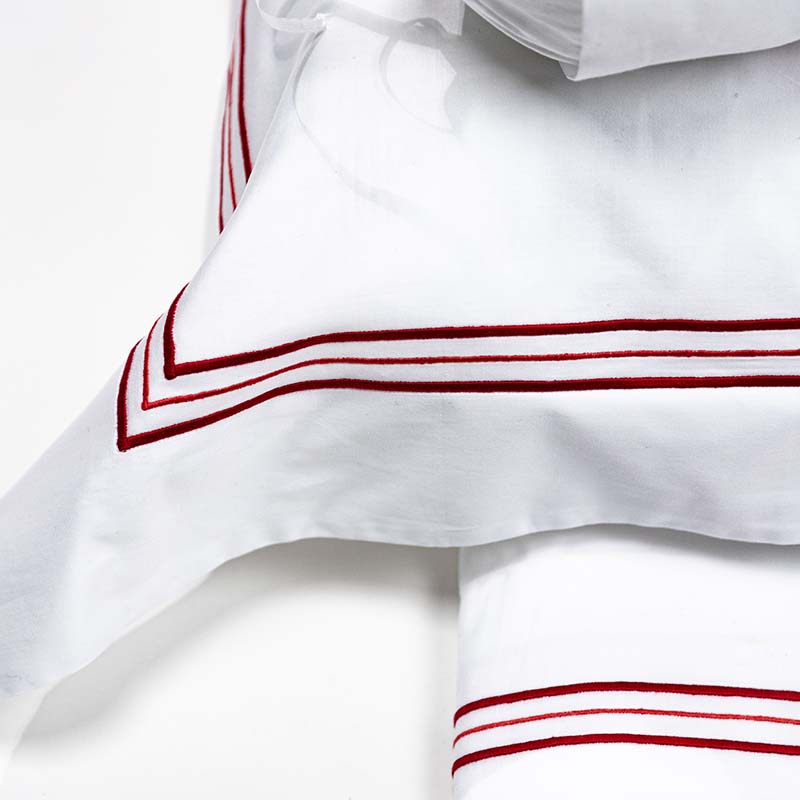For your made-to-order bed linen, you can choose between Egyptian percale for a matte, crisp look or satin for a silky, luminous finish. Moreover, you can customize the colors of the embroidered cord trims and add personalized embroidery to make your linens truly unique.