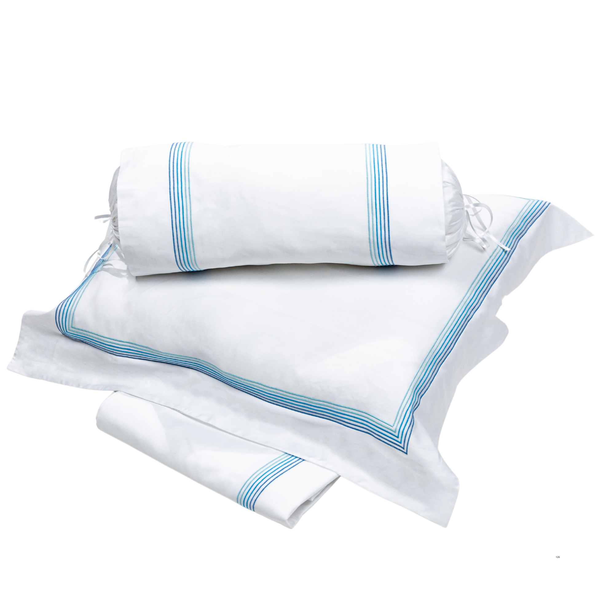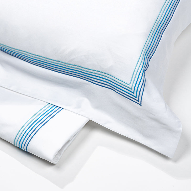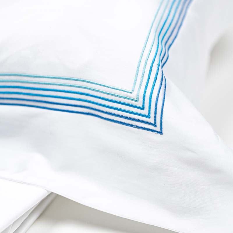 For your made-to-order bed linen, you can choose between Egyptian percale for a matte, crisp look or satin for a silky, luminous finish. Moreover, you can customize the colors of the embroidered cord trims and add personalized embroidery to make your linens truly unique.